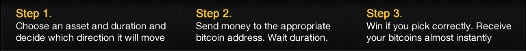 For example, if the current price of the EUR/USD is 1.2935 and you believe that this will rise over the option's duration, you would pick up. To actually place your trade, simply send bitcoin to the appropriate bitcoin address that reflects your decision. This transactions takes place almost instantly, and once your bitcoin investment has been receieved by the Satoshi Option servers, the option's duration will commence immediately. After the option's duration has expired, your decision will be correct, or incorrect. When you make a correct decision, you will recieve a return on your investment almost instantly. The rate of return is indicated on this website. In summary;Send the bitcoin amount you would like to invest to the appropriate bitcoin address presented on the Satoshi Option website.